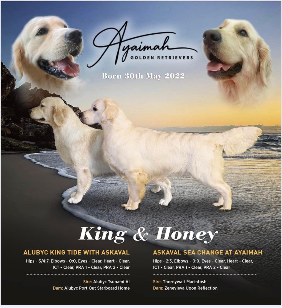 Madi “Ayaimah What a Beautiful Noise” is the daughter of Honey “Askaval Sea Change at Ayaimah” & King “Aust CH Alubyc King Tide with Askaval”. Honey is a beautiful, golden girl with the most wonderful temperament and on her way to being titled as an Australian Champion. King is an exceptional stud dog. He has his Australian Champion title, is a Best in Group winner, a Brisbane Royal Best in Group winner, and a runner up to Best in Specialty Show winner. He has been a wonderful contribution to the gene pool, having been credited with significantly lowering the hip scores of his progeny, Madi included.